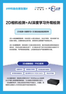 3D测量+2D人工智能检测标准机可以检测瑕疵的成像图片与正常产品的成像图片存在灰阶差异,从而使系统能够精准发现产品的缺陷;同时根据事先采集各类瑕疵的图像特征并记录缺陷库,进行深度学习训练模型从而实现了瑕疵在线检测,以及瑕疵的分类与后续处置。